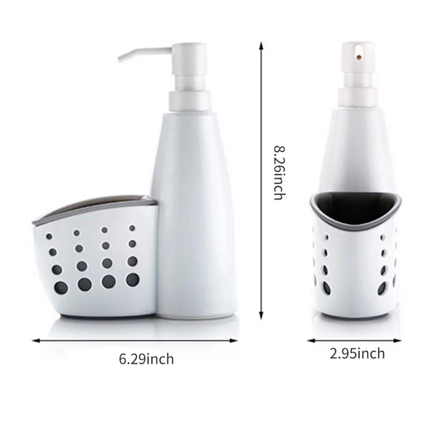 It combines a liquid detergent dispenser with a storage compartment for sponges, brushes, and cleaning tools.