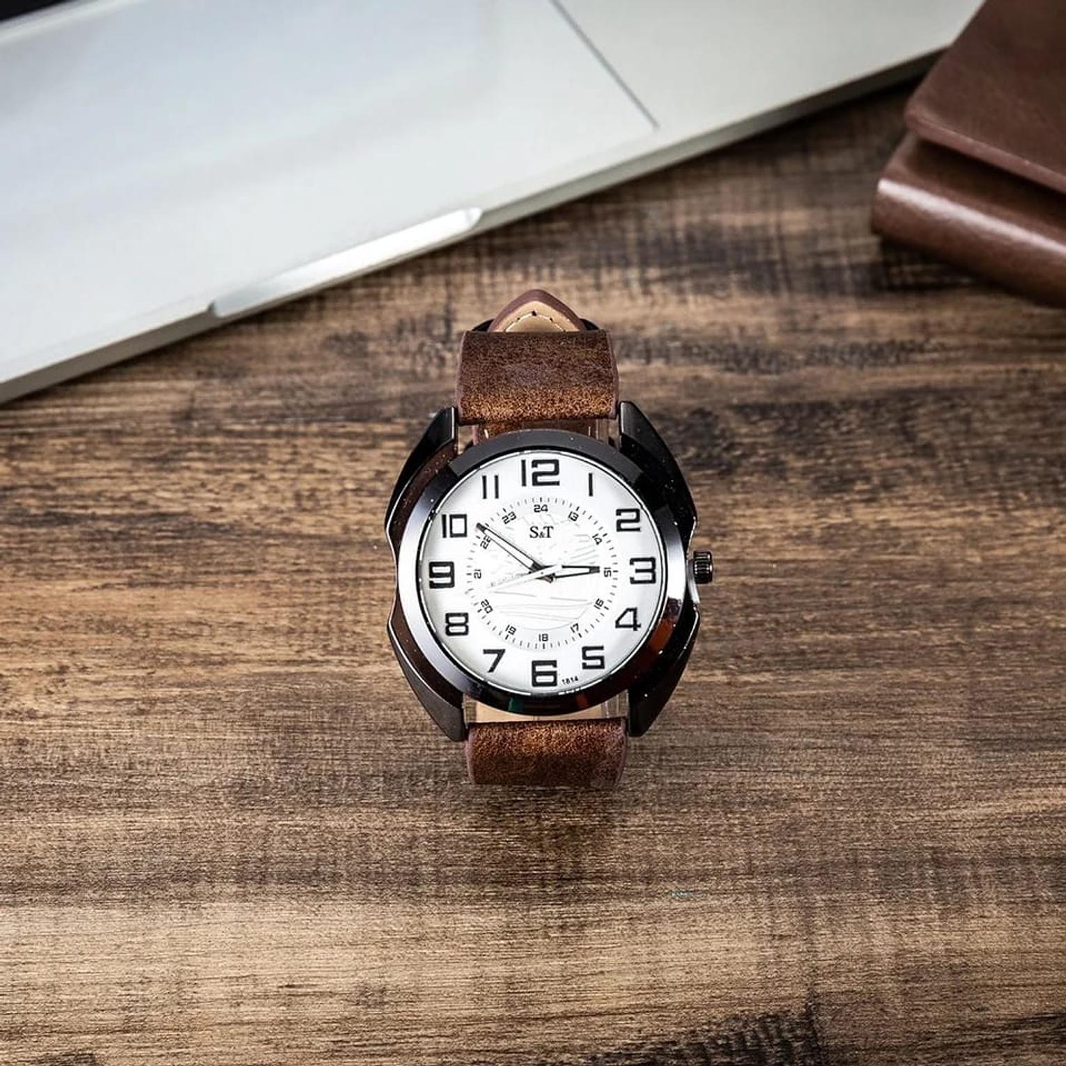 • Durable Leather Strap: The watch is equipped with a premium dark brown leather band that offers both a comfortable fit and a classic masculine aesthetic.