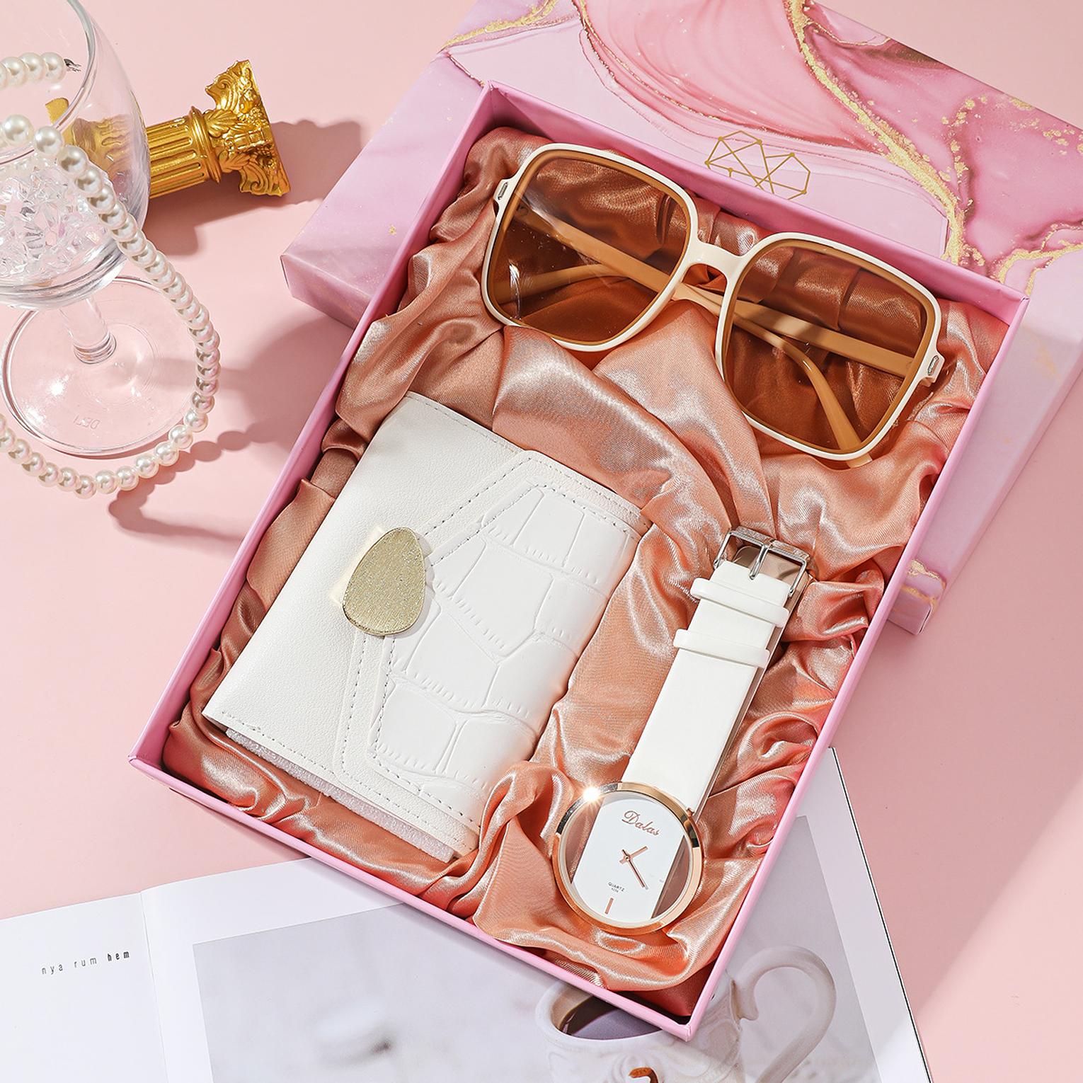 Elevate your style with this sophisticated 3-piece accessories set, featuring a minimalist quartz wristwatch, fashionable oversized sunglasses, and a premium crocodile-patterned wallet. Beautifully presented in a luxury marble-print gift box with a satin lining, this set is the perfect high-end souvenir or gift for birthdays, anniversaries, and special celebrations.